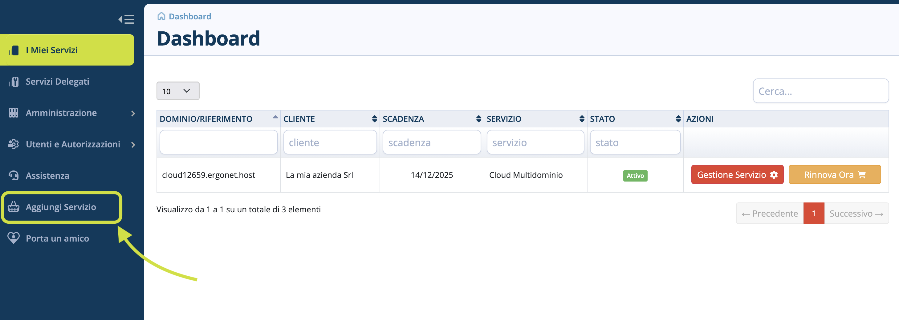 Una volta eseguito il login al WebPanel, dovrai cliccare su "Aggiungi Servizio", che ti inoltrerà su https://store.ergonet.it/store