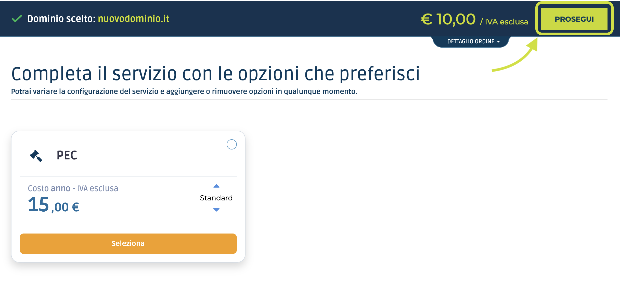 Se non hai necessità di includere opzioni aggiuntive per il servizio come la Pec, clicca di nuovo "Prosegui"