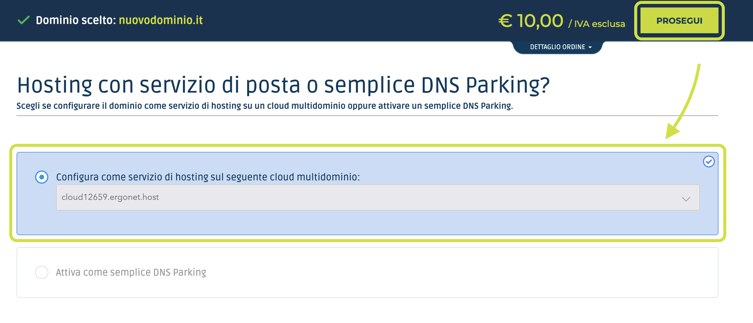 A questo punto potrai scegliere di associare il nuovo dominio al tuo cloud multidominio, andando a selezionare la prima scelta "Configura come servizio di hosting sul seguente cloud multidominio"