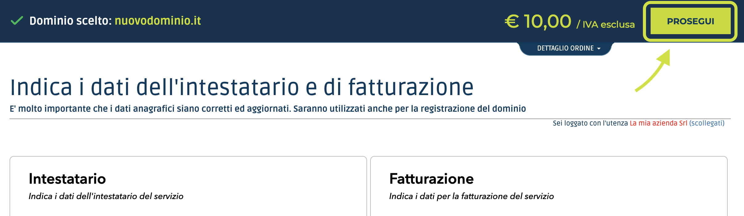 Nella schermata successiva dovrai andare ad indicare i dati intestatario e quelli di fatturazione; una volta fatto clicca nuovamente su "Prosegui"