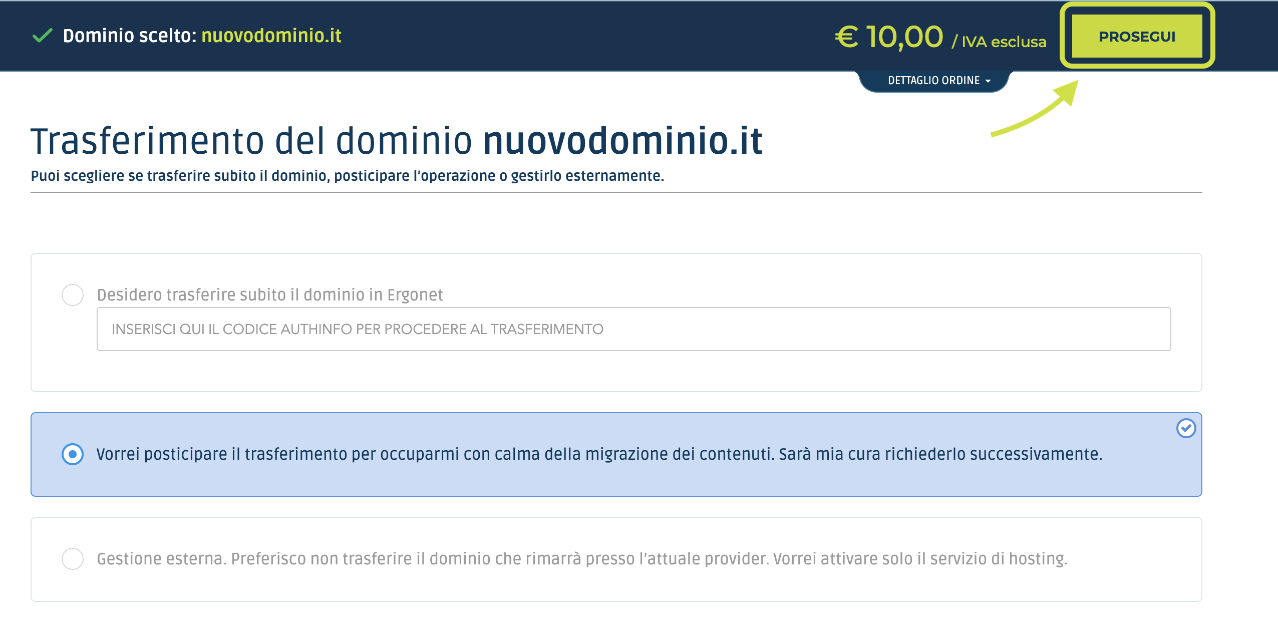 Se si tratta di una migrazione di un dominio già esistente, ti vorrà chiesto come gestire il trasferimento. Se hai dei contenuti da migrare, dovrai lasciare impostata la scelta predefinita "Vorrei posticipare il trasferimento per occuparmi con calma della migrazione dei contenuti. Sarà mia cura richiederlo successivamente.", in modo da avviare il trasferimento solo dopo conclusa la copia del sito / mail.