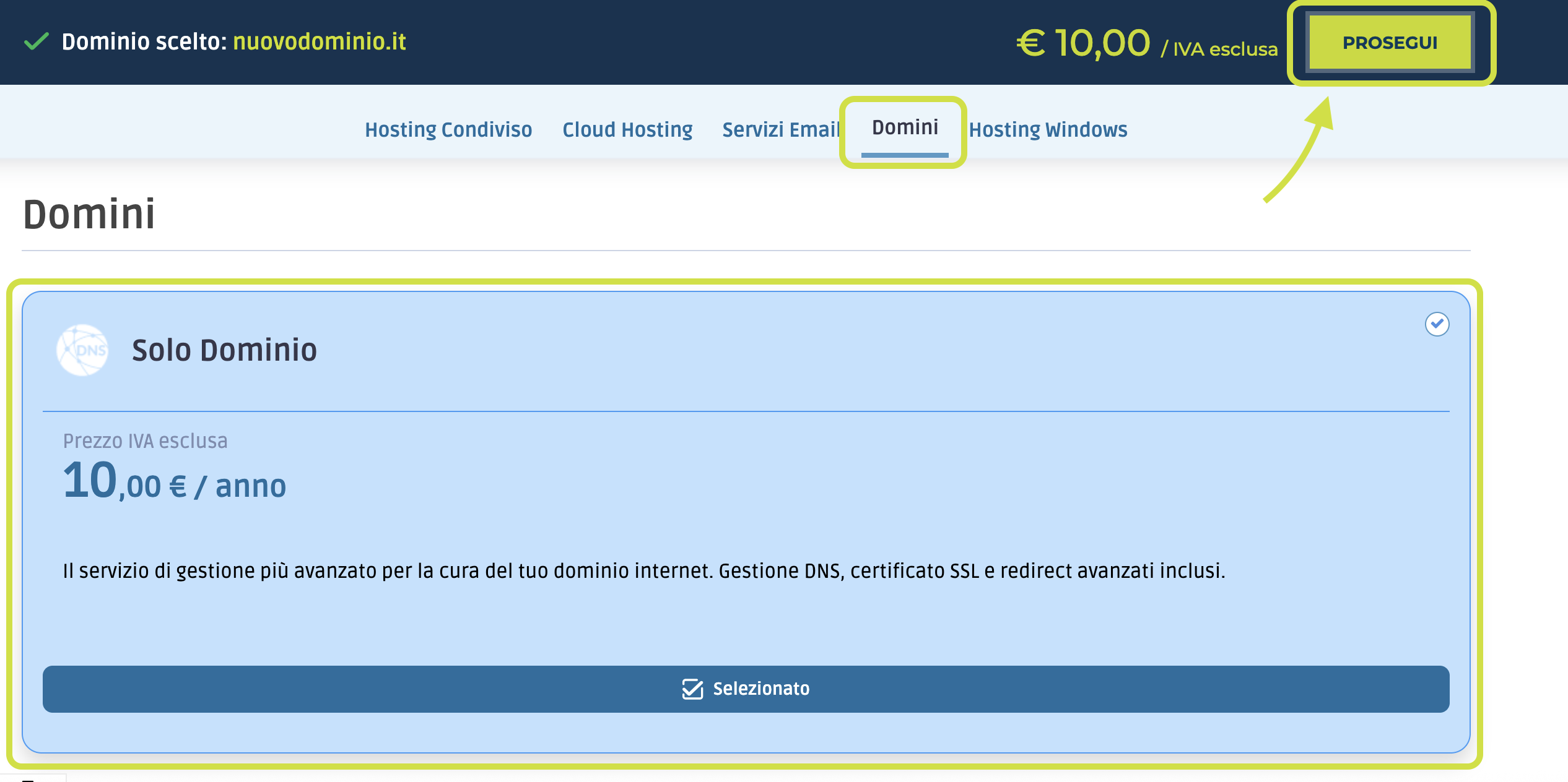 Quindi clicca sul riferimento "Domini" proposto nel banner in alto, seleziona il prodotto "Solo Dominio" quindi "Prosegui"