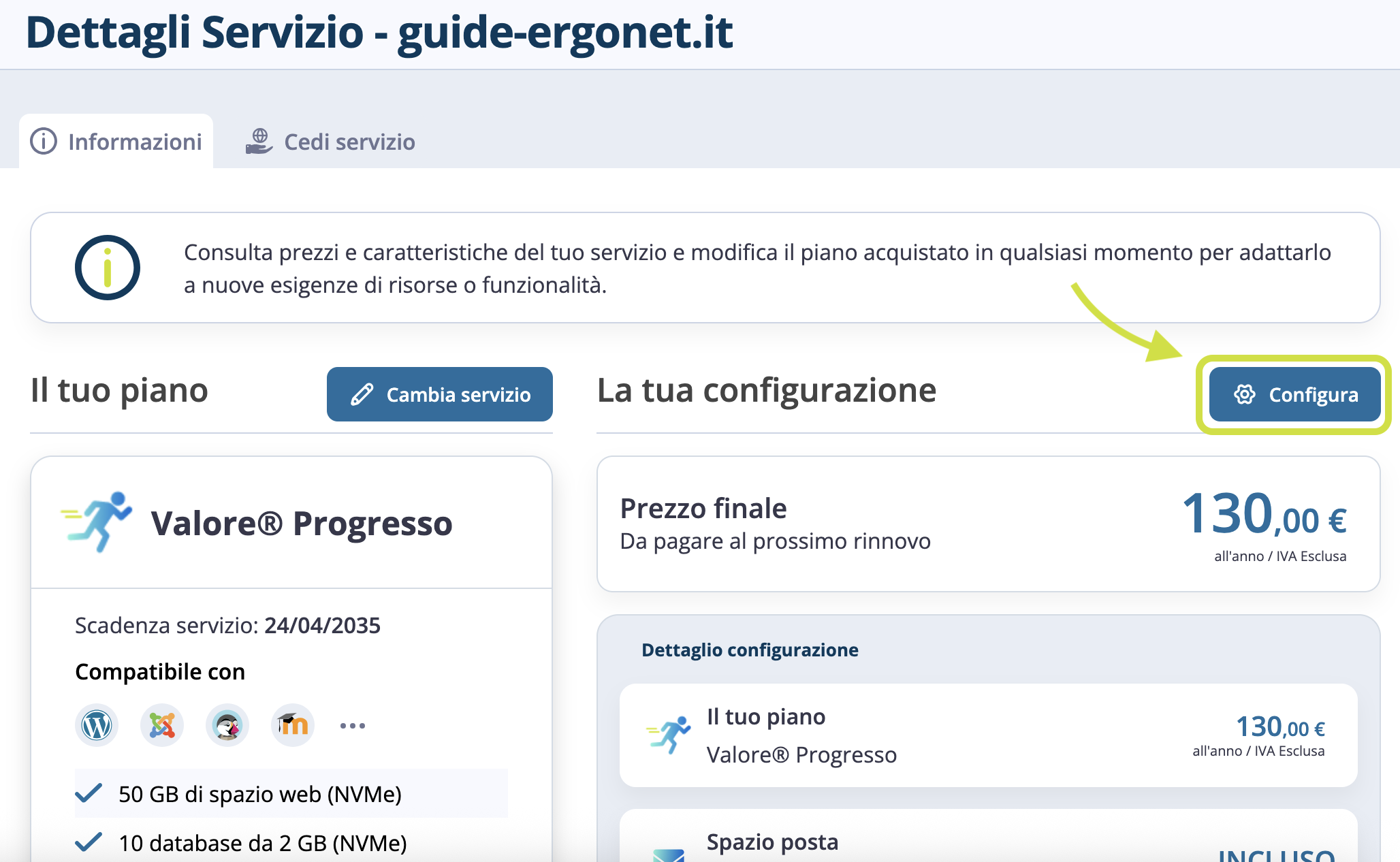 Nella schermata ti sarà mostrata l’attuale configurazione attiva sul piano di hosting e potrai procedere alla variazione semplicemente cliccando sul tasto “Configura”.