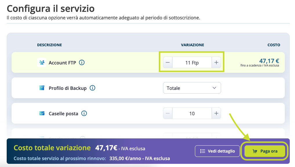 Per confermare la variazione apportata, sarà necessario cliccare sul tasto “Paga ora” che troverai in basso a destra, ed eseguire il pagamento dell'ordine. Dal momento in cui viene eseguito il pagamento, l'opzione di backup verrà attivata entro circa 5 minuti.
