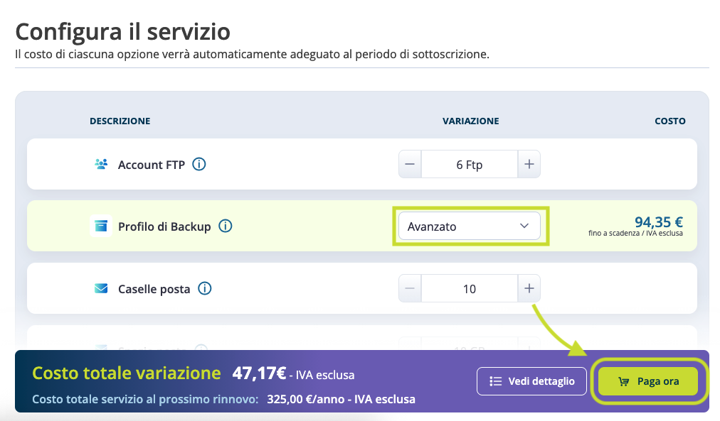 Per confermare la variazione apportata, sarà necessario cliccare sul tasto “Paga ora” che troverai in alto a destra, ed eseguire il pagamento dell'ordine. Dal momento in cui viene eseguito il pagamento, l'opzione di backup verrà attivata entro circa 5 minuti.