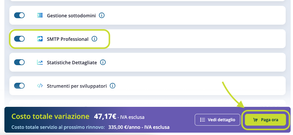 Per confermare la variazione apportata, sarà necessario cliccare sul tasto “Paga ora” che troverai in alto a destra, ed eseguire il pagamento dell'ordine. Dal momento in cui viene eseguito il pagamento, l'opzione SMTP Professional verrà attivata entro circa 5 minuti.