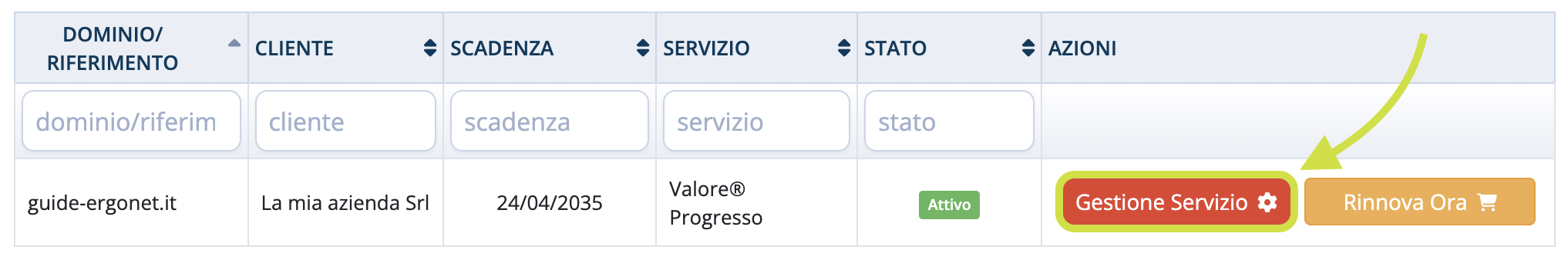 Una volta effettuata la login nel tuo WebPanel, clicca sul tasto “Gestione Servizio” in corrispondenza del dominio/servizio sul quale vuoi apportare la variazione del piano di hosting.