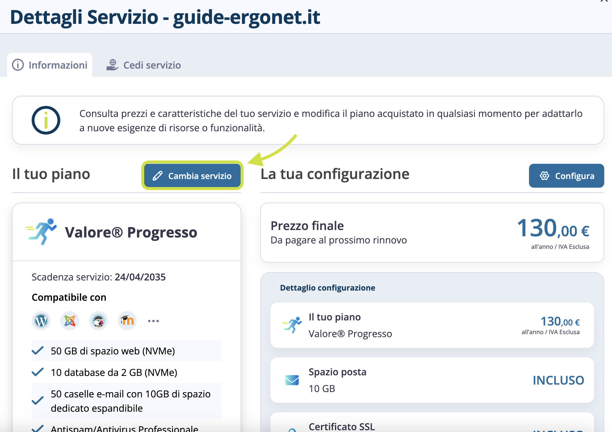Nella schermata ti sarà mostrata l’attuale configurazione attiva sul piano di hosting e potrai procedere alla variazione semplicemente cliccando sul tasto “Cambia Servizio”.