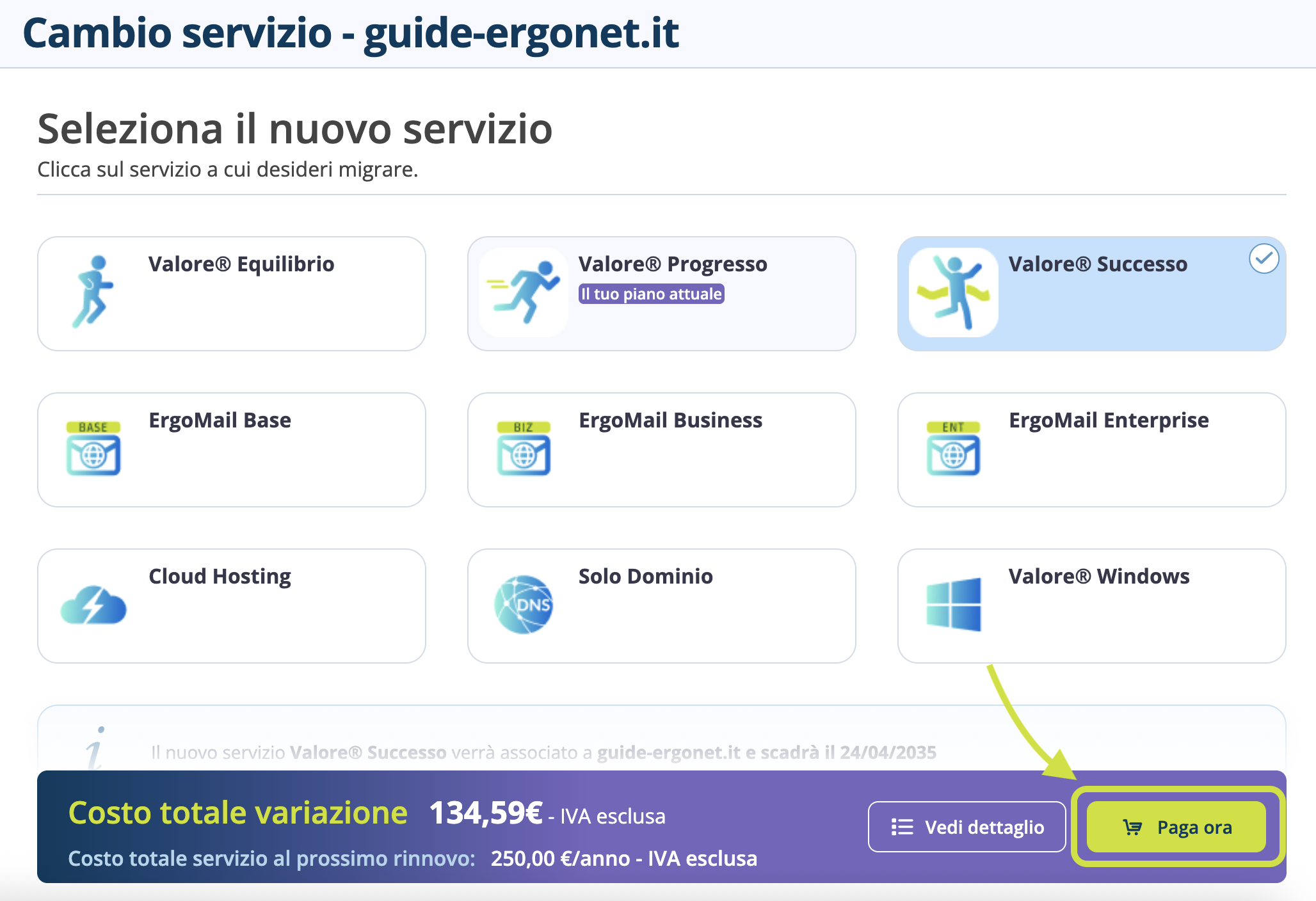 Per confermare la variazione apportata sarà necessario cliccare sul tasto "Paga ora" che troverai nell’angolo in basso a destra della pagina ed eseguire il pagamento. Nel caso non fosse richiesta un'integrazione o avessi eseguito il downgrade ad un altro prodotto, troverai sempre in basso a destra il tasto "Conferma" da selezionare.